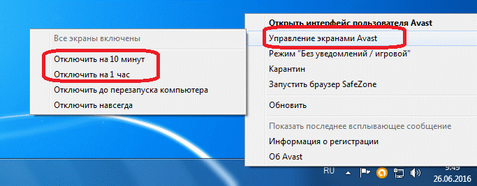 - Откроется дополнительное меню, в котором вы можете выбрать: отключить на 10 минут, на 1 час, до перезагрузки ПК или ноутбука или навсегда;