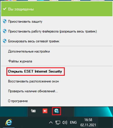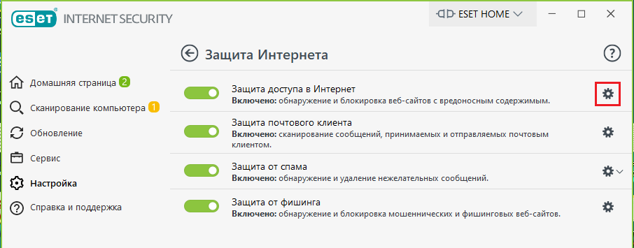 Далее выбираем настройки и открываем параметр Защита интернета, после чего жмем на иконку шестерёнки.