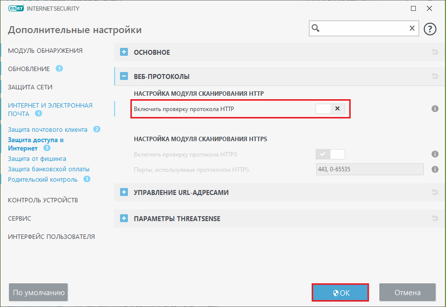 - После чего выбираем пункт веб-протоколы и отключаем проверку протокола HTTP и сохраняем настройки.