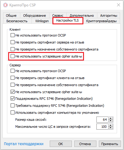 Запустите программу КриптоПро CSP с правами администратора. Перейдите на вкладку «Настройки TLS» и снимите галочку «Не использовать устаревшие cipher suite-ы». После изменения данной настройки нужно обязательно перезагрузить компьютер