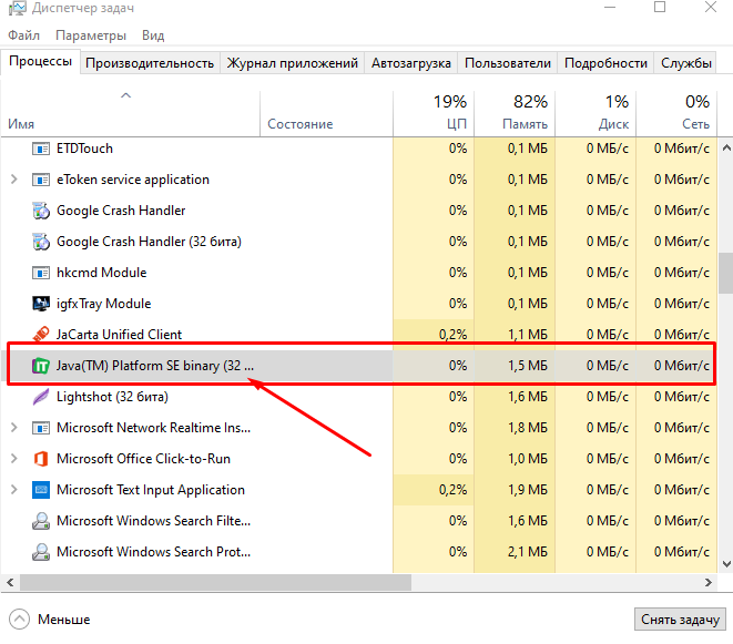 - Найти процесс отвечающий за приложение ITCOM (Рисунок 1), выбрать его и нажать «снять задачу»