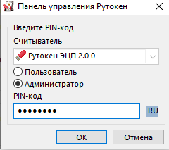 - Введите пароль Администратора (Для носителей: JaCarta PKI/ГОСТ/SE: 0987654321, Для носителя: JaCarta LT: 87654321), затем нажимаете кнопку «OK«