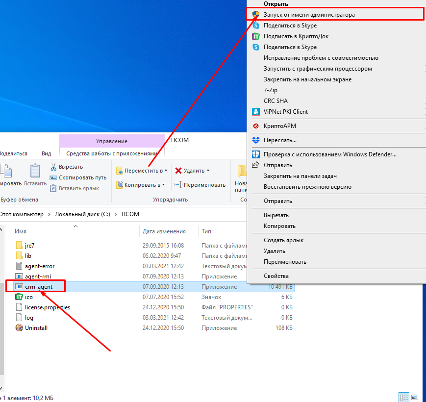 - После выполненных действий заходим на Диск (с) в папку ITCOM и запускаем от имени администратора приложение crm-agent