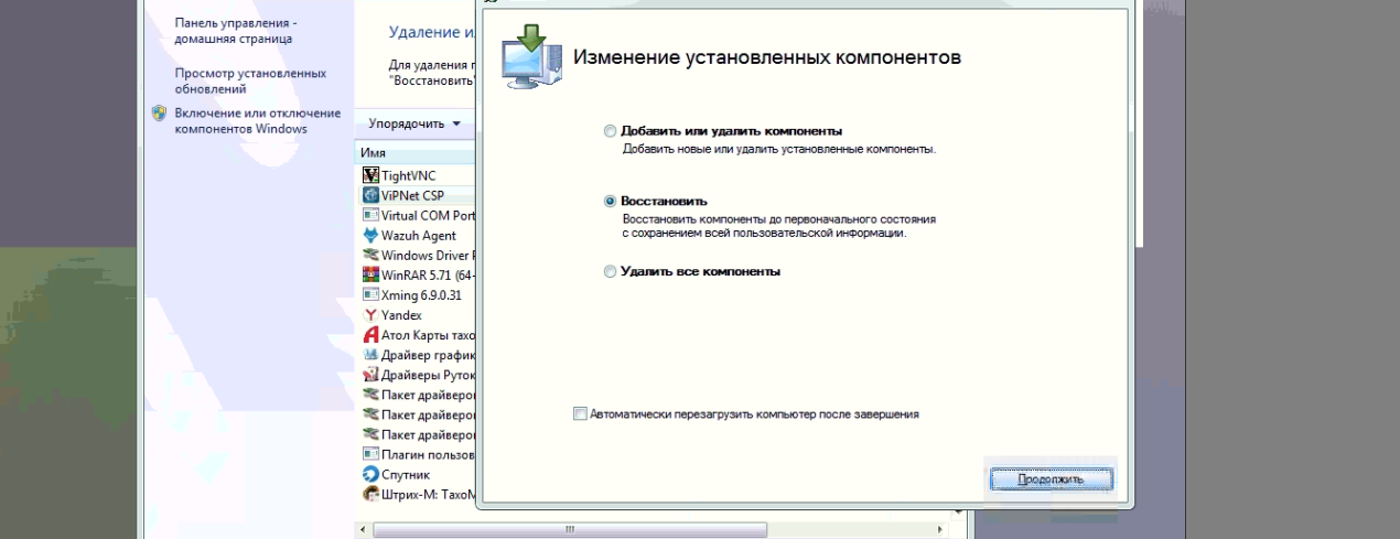 2. Если ваш криптопровайдер VipNet CSP и выходит данная ошибка, вам требуется: открыть панель управления ->Программы и компоненты -> Удаление программ -> выбрать программу «VipNet CSP» и нажать «Изменить» в новом окне выбрать «Восстановить»
