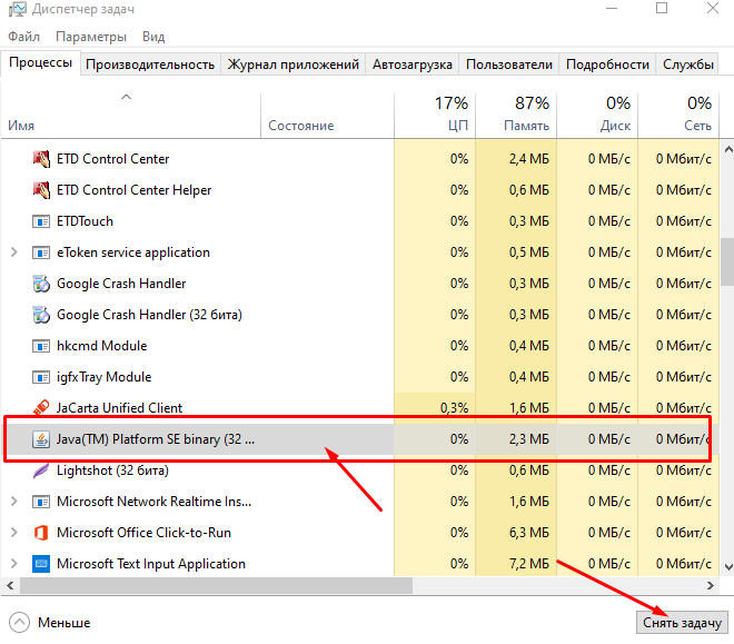 - Необходимо зайти в диспетчер задач и завершить процесс изображенный на Рисунке (нажимаете на процесс->завершить задачу)