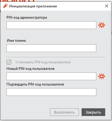 - Проводите инициализацию носителя (Рисунок 3), PIN-код администратора для проведения операции инициализации: 0987654321 (по умолчанию), PIN-код пользователя: 1234567890 (по умолчанию) и нажимаете выполнить.