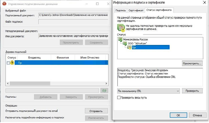 - Не удалось полностью проверить один или несколько сертификатов в цепочке.