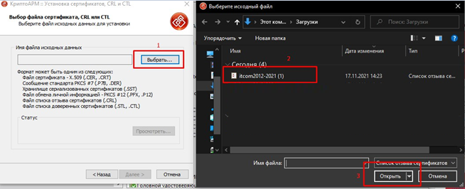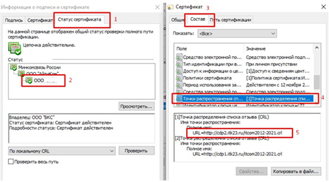 1 – нажимаем Статус сертификата, 2 – двойным кликом открываем сертификат, 3- нажимаем Состав, 4 – выбираем Точки распространения, 5 – выделяем ссылку после = , нажимаем Ctrl + C (плюс не нажимаем , одновременно две клавиши Ctrl и C на клавиатуре), вставляем ссылку в строке поиска в браузере.
