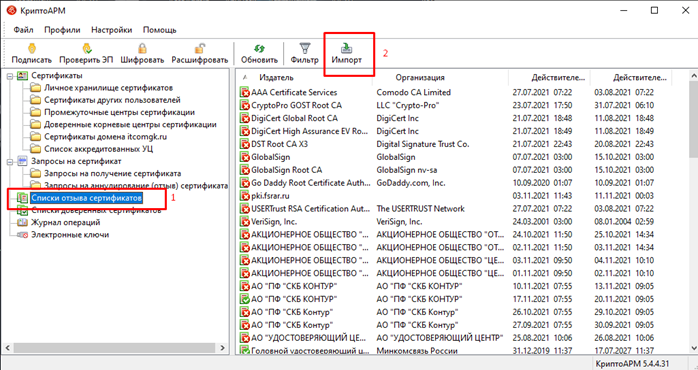 - Запоминаем куда сохранился файл, и открываем программу КриптоАРМ. Нажимаем списки отзыва сертификатов, и нажимаем Импорт: