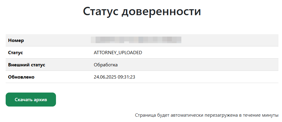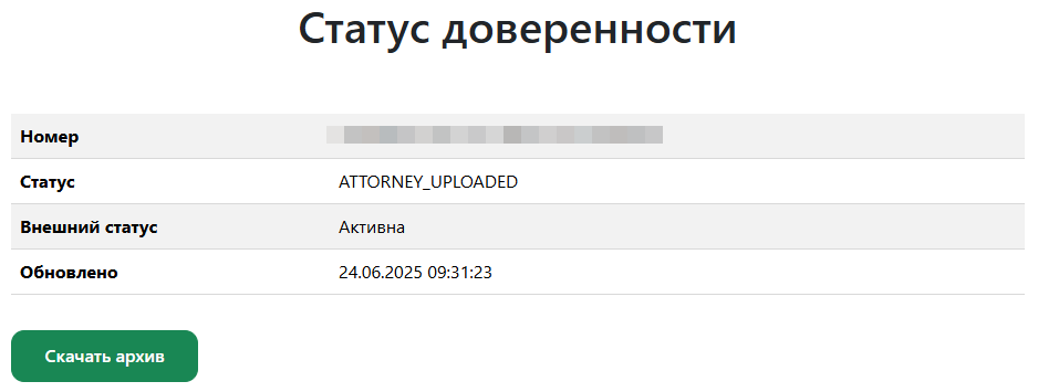 После успешной обработки и регистрации внешний статус доверенности автоматически обновится на «Активна».