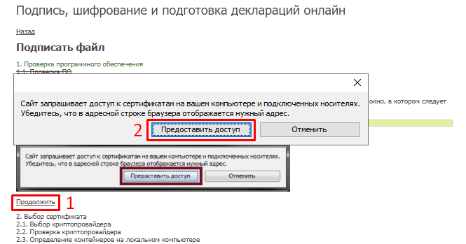 4. Обновите страницу подписания файла в браузере. На странице должно появиться окно запроса доступа к сертификатам. Нажмите «Продолжить».