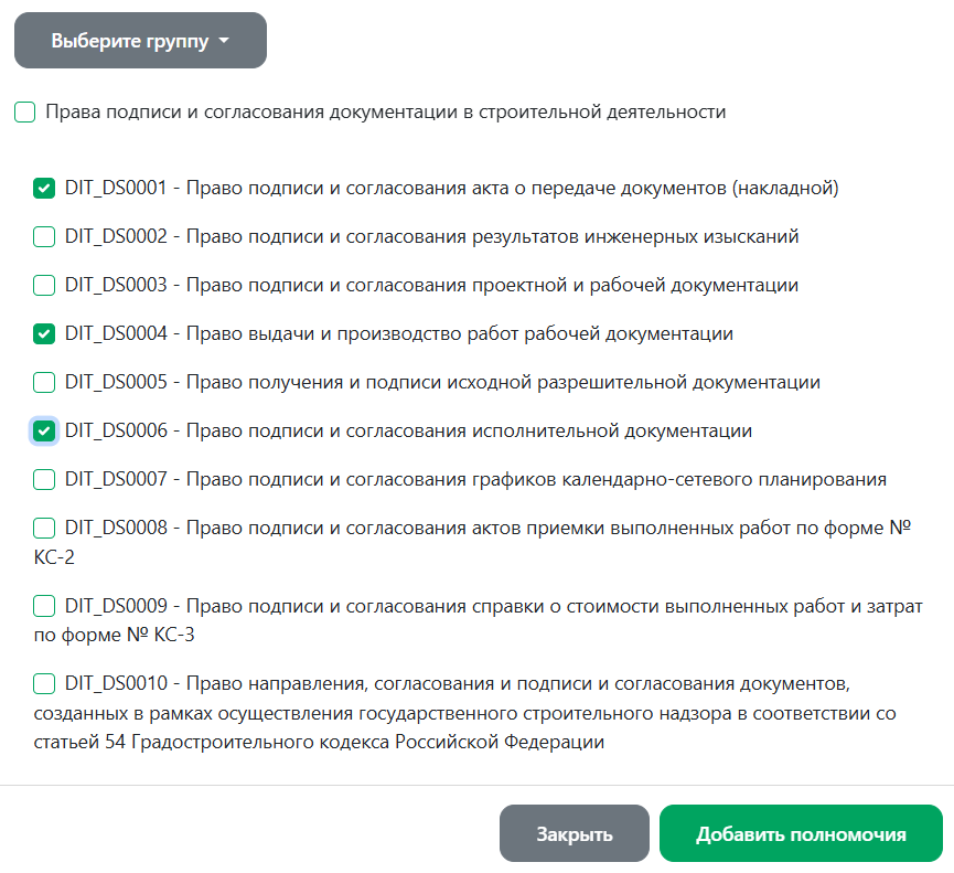 После того как вы нашли и отметили чек боксом все необходимые полномочия в списке, нажмите кнопку «Добавить полномочия».