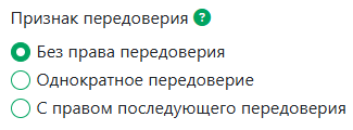 Укажите параметр передоверия. Укажите, разрешено ли ее передоверие (передача полномочий другому лицу).