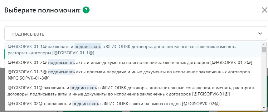 Или введите любое слово, связанное с нужным полномочием. Система найдет все полномочия, содержащие это слово в описании.