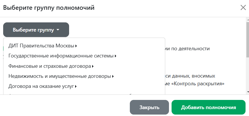 При выборе полномочий из готовых групп сначала выберите подходящую категорию, а затем найдите в списке нужную структуру или портал.