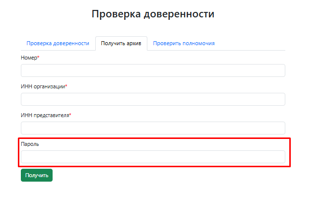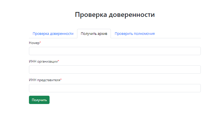 Указав номер доверенности, ИНН организации/ИП и ИНН представителя нажав клавишу «Проверить», нам становиться клавиша «Скачать архив».