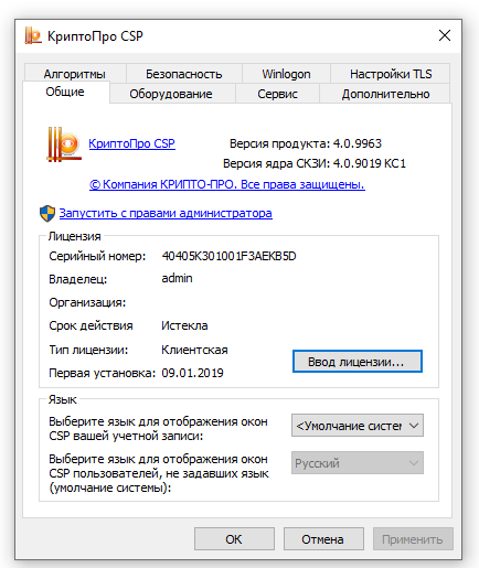 Если лицензия «Истекла» и у Вас есть бланк с актуальной лицензией, введите серийный номер из бланка нажав на кнопку «Ввод лицензии». Подробнее — Как ввести лицензию КриптоПро CSP.