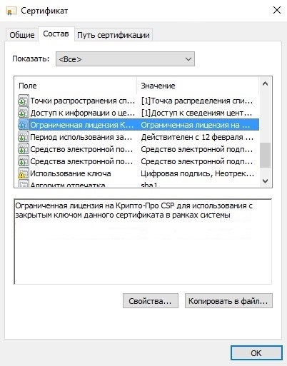| В сертификате есть встроенная лицензия, если в открытом ключе сертификата на вкладке «Состав» присутствует поле «Ограниченная лицензия Крипто-Про». |