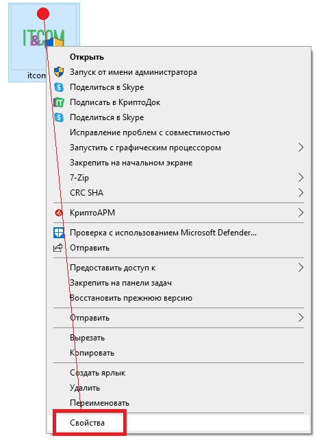 - Нажмите правой кнопкой мыши по приложению itcom и выберите «Свойства»