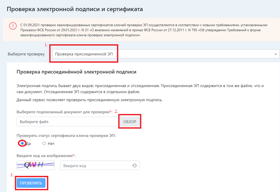Выберите «Проверка присоединенной ЭП» — выберите файл который необходимо проверить нажав «Обзор» — введите код с картинки и нажмите «Проверить»