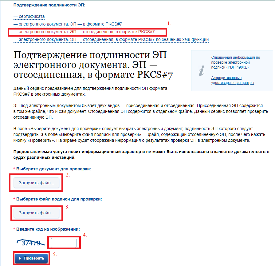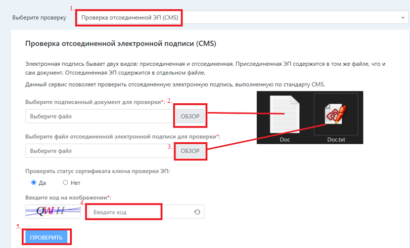 Выберите «Проверка отсоединенной ЭП» — выберите файлы которые необходимо проверить нажав «Обзор» — введите код с картинки и нажмите «Проверить»