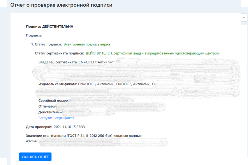 После проверки вы увидите новую страницу с информацией о проверке вашего документа, подписанного ЭП