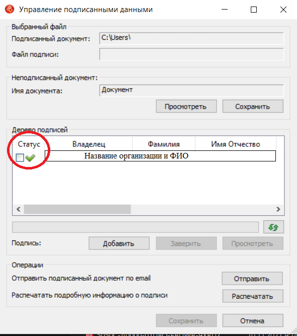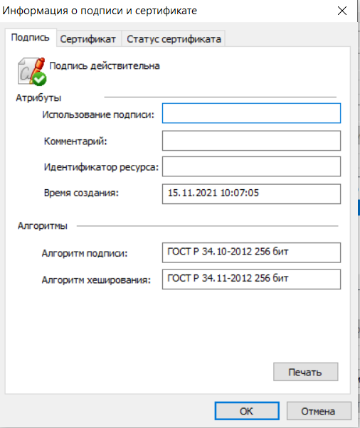 Откроется окошко в котором вы увидите статус документа, Если вы видите зеленую галочку, значит ваш документ подписан корректно