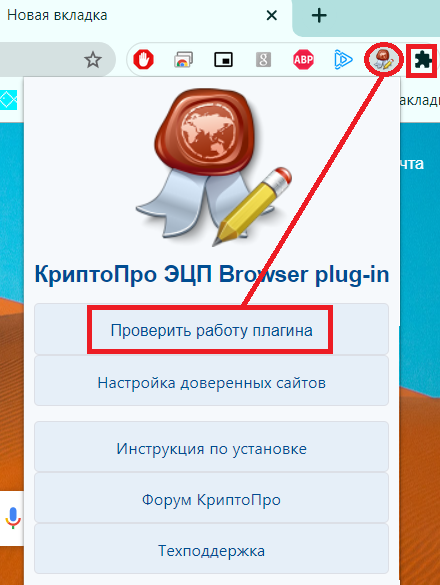 Для этого нажмите на значок мозаики в вашем браузере и выберете плагин КриптоПро ЭЦП Browser plug-in, далее нажмите «Проверить работу плагина«