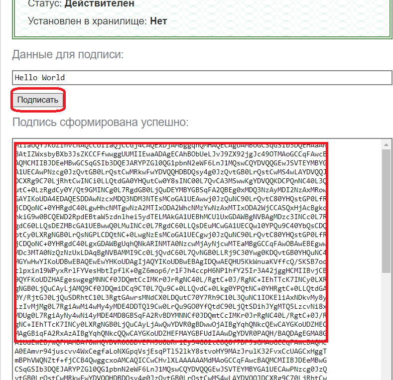 Чуть ниже нажмите кнопку «Подписать» и увидите набор символов который говорит о том что ваша подпись работает корректно.