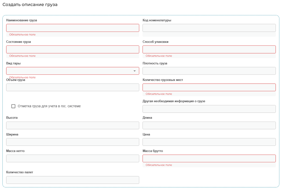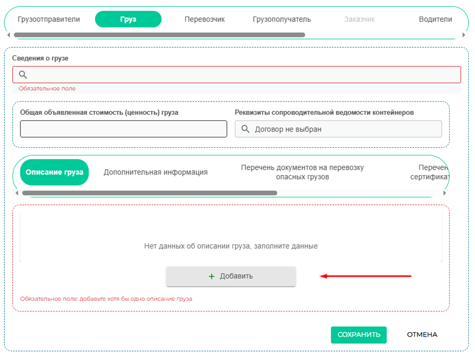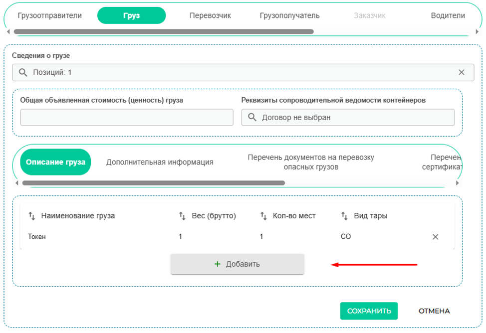 Далее заполняем описание груза, для этого жмем клавишу «Добавить».