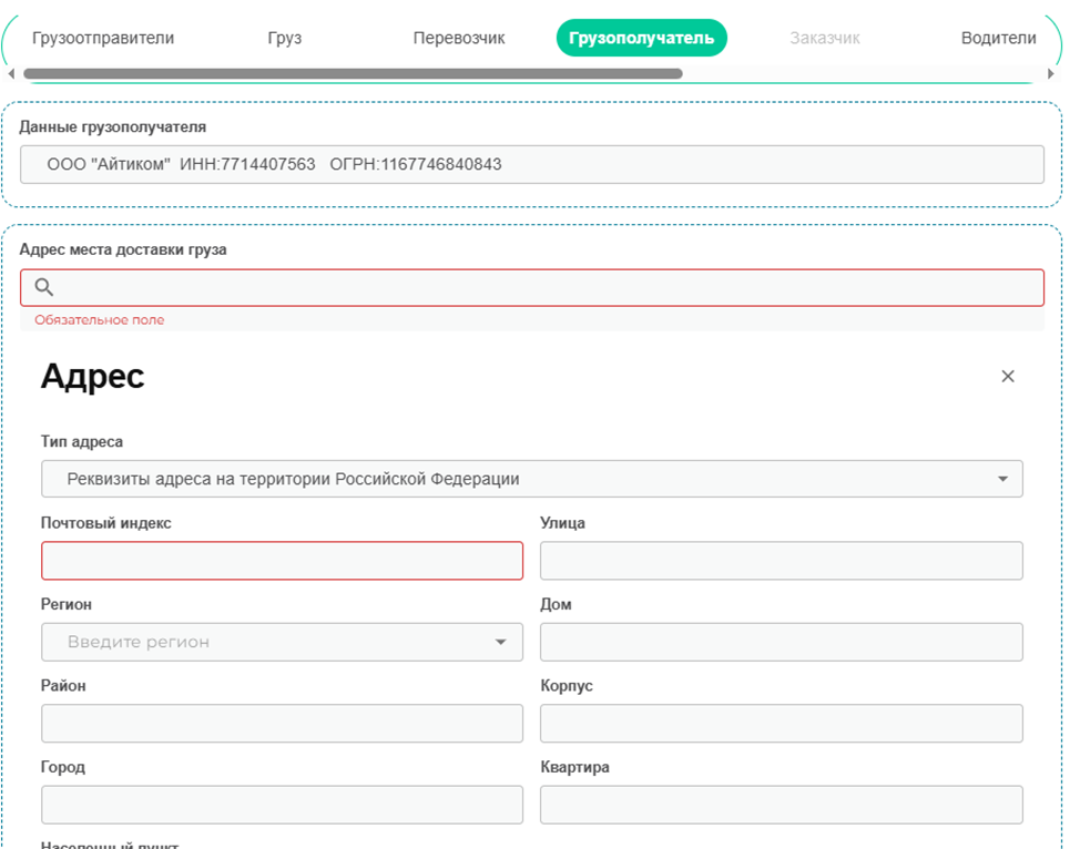 Далее переходим в раздел «Грузоотправитель» и заполняем адрес места доставки груза.