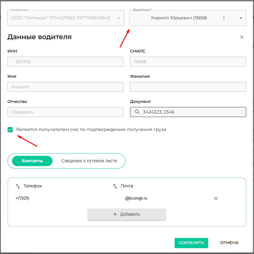 Данные пользователя подтянуться автоматически, если требуется сменить водителя, можете выбрать нужного во вкладе «Водитель». Также обязательно поставьте галочку в поле «Является получателем смс по подтверждению получения груза» и жмем клавишу «Сохранить».