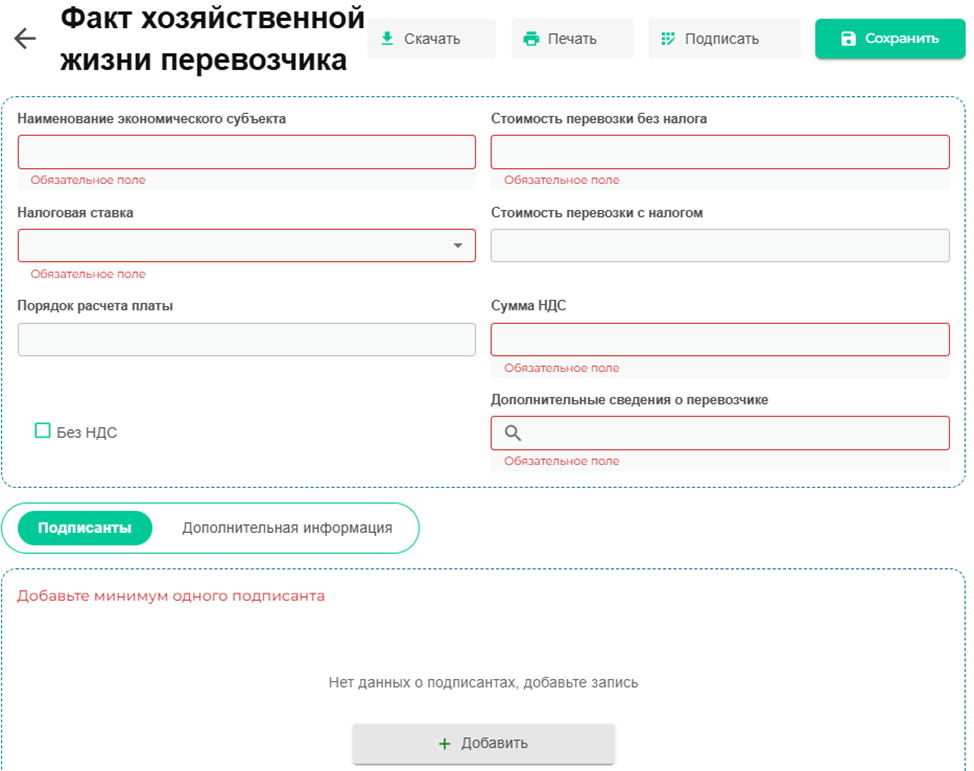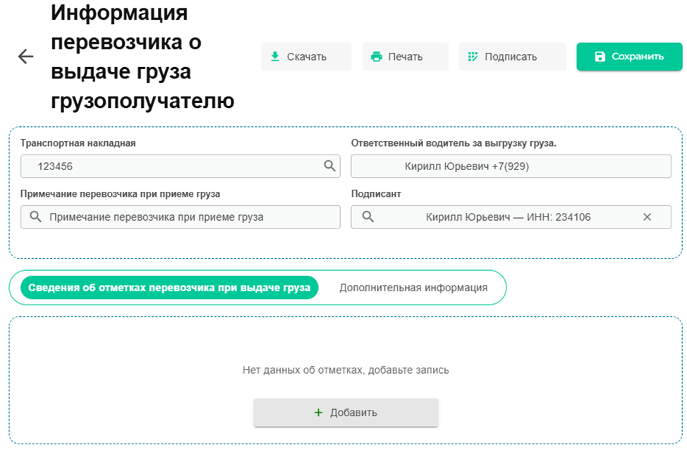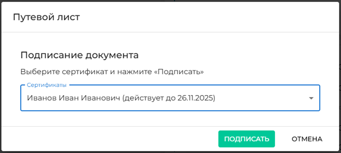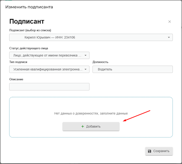 После чего выбираем нового водителя/транспортное средство, после заполняем все обязательные поля, жмем клавишу «Сохранить». После чего выбираем подписанта и жмем клавишу «Подписать».