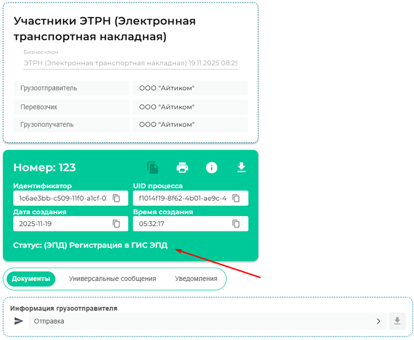 На данном этапе требуется дождаться регистрации транспортной накладной в ГИС ЭПД.
