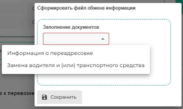 После чего выбрать причину смену данных, в нашем случаи выбираем «Замена водителя и (или) транспортного средства» и жмем клавишу «Сохранить».