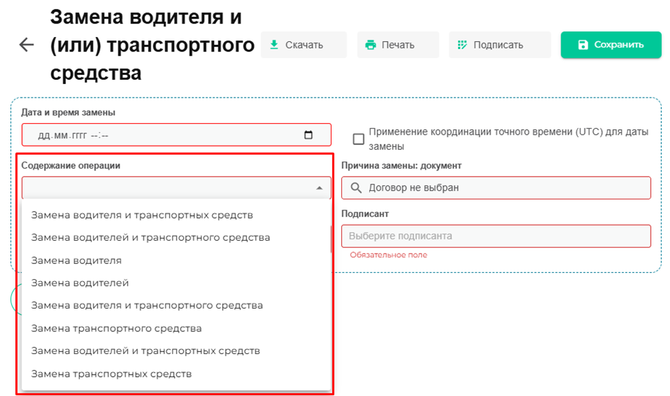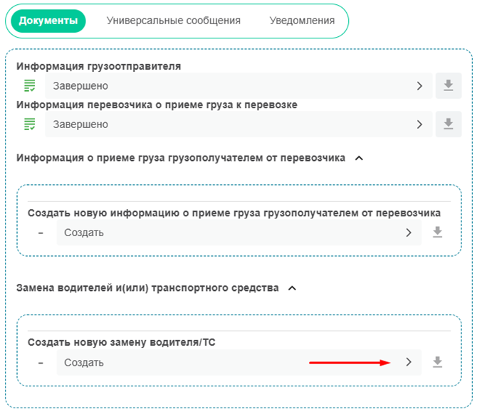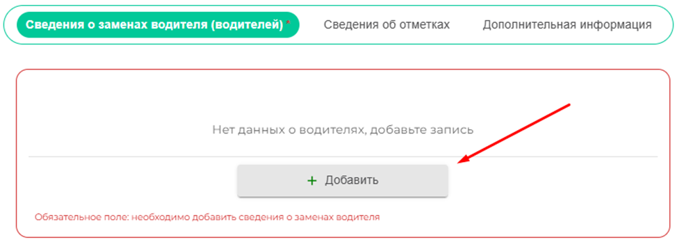 Как только выберите причину у вас ниже появится раздел «Сведения о заменах водителя/Сведения о заменах транспортного средства».
