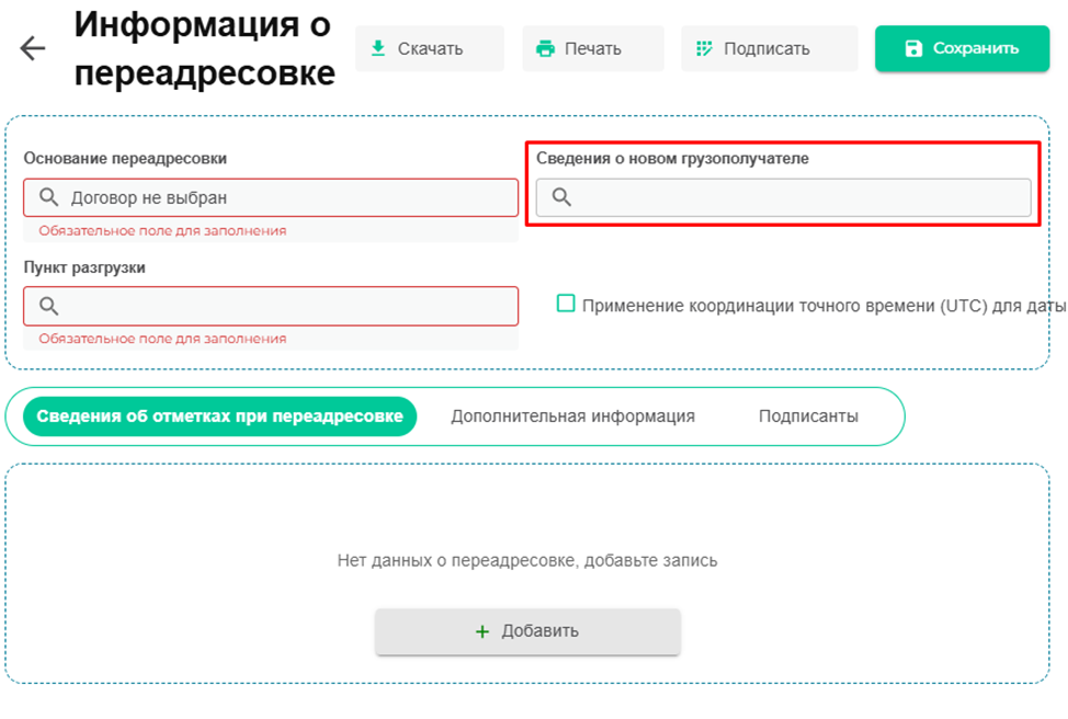 На следующем этапе заполняются все обязательные поля. Если производится полная замена организации-получателя, дополнительно вносятся данные в блоки «Сведения о новом грузополучателе» и «Новый адрес получения груза».
