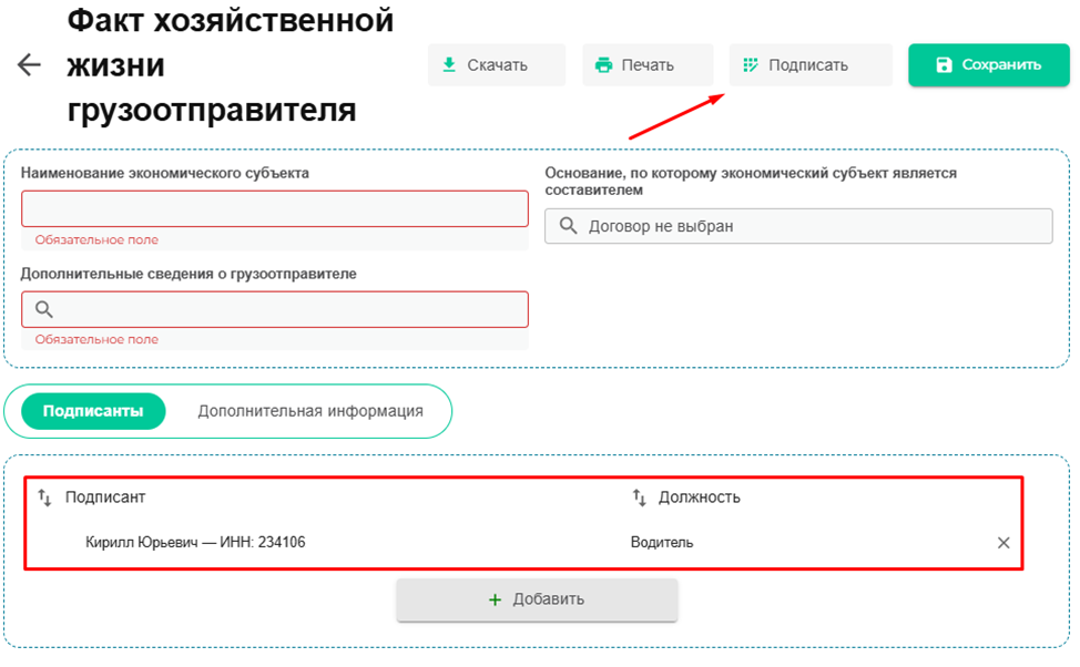 Также заполняем все обязательные поля, выбираем подписанта, после чего жмем клавишу Подписать».