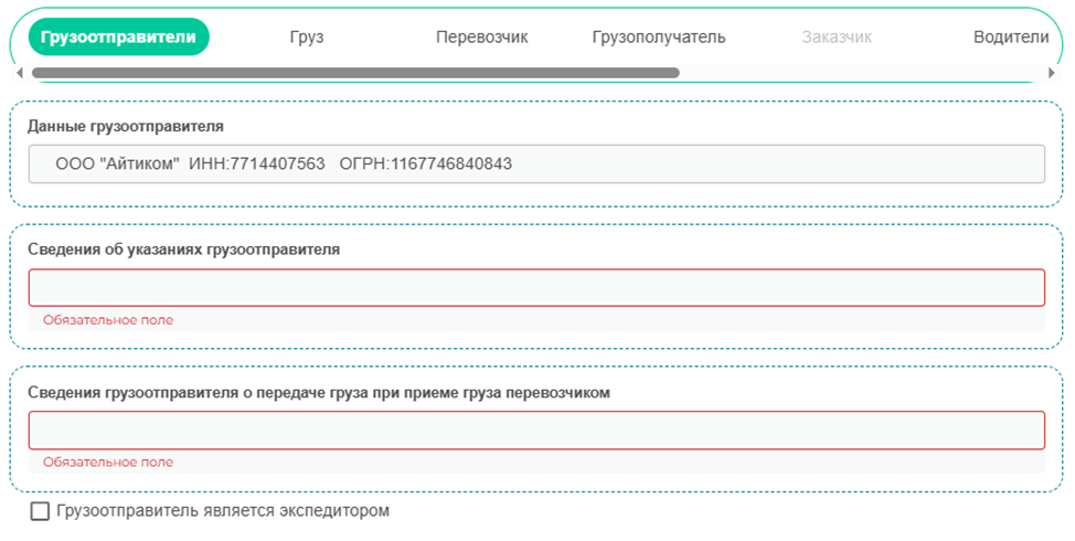 На следующем этапе требуется заполнить обязательные поля в разделе «Грузоотправители».
