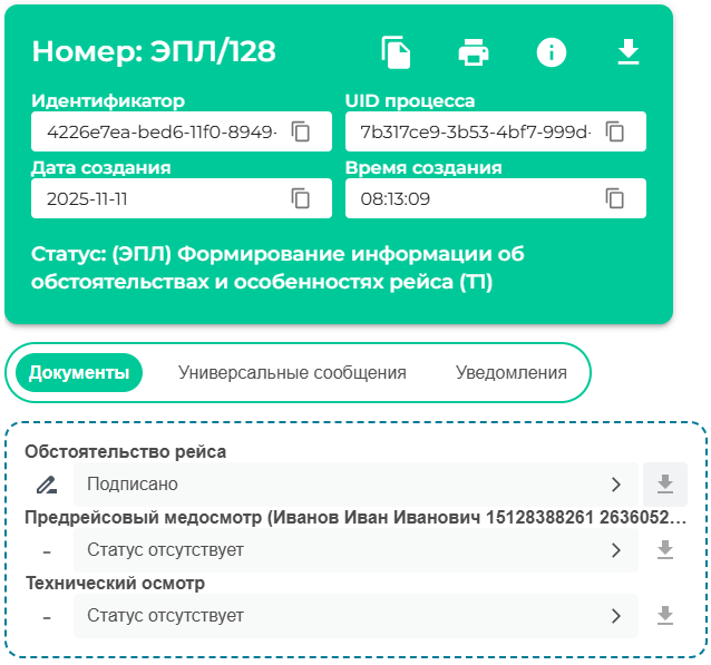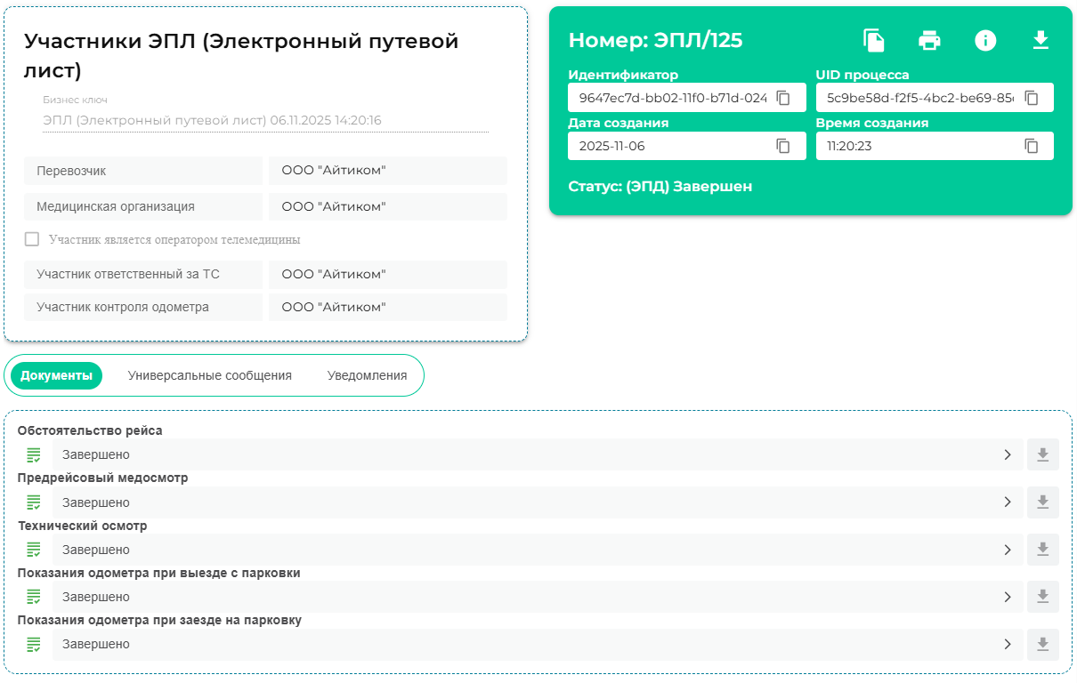 После того все титулы подписаны ИС ЭПД завершает работу с данным ЭПЛ, информацию о всех ранее созданных и завершенных документах возможно посмотреть в разделе «Мои документы».
