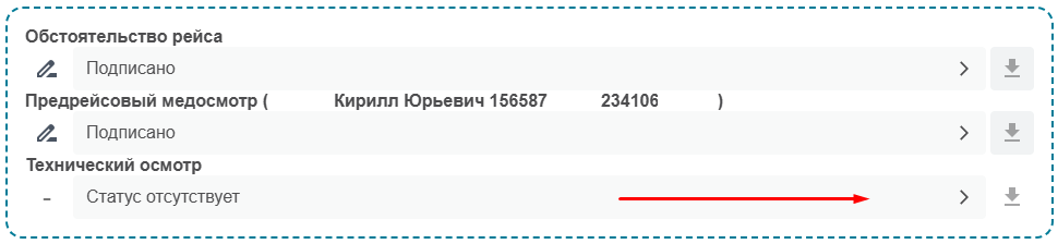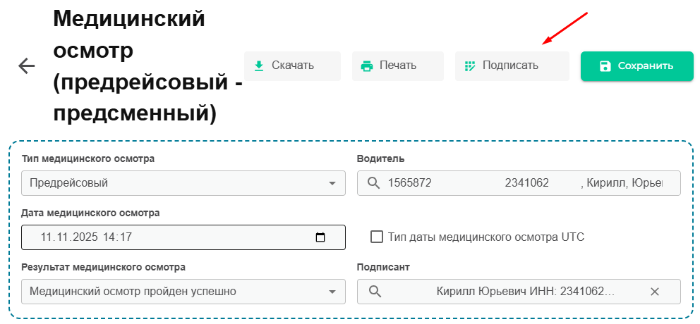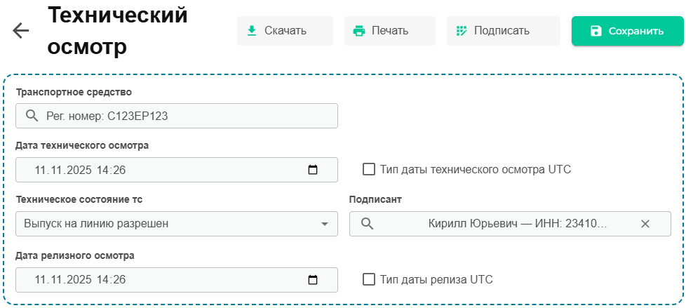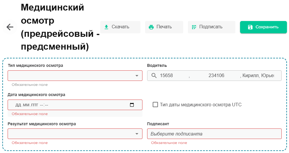 Приступаем к заполнению предрейсового/предсменного технического осмотра.