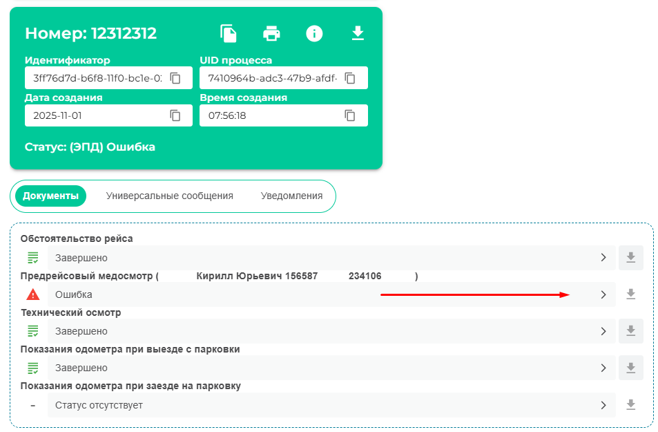 Если водитель не прошел медицинский осмотр или технический осмотр, в разделе документы выйдет ошибка, открываем данную ошибку.