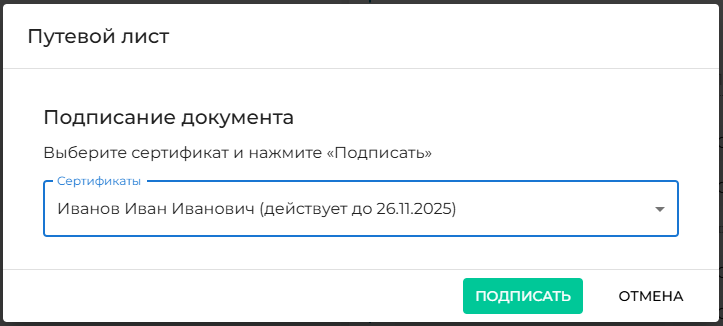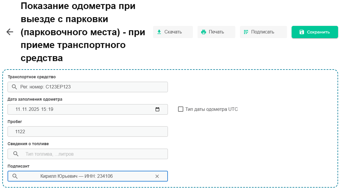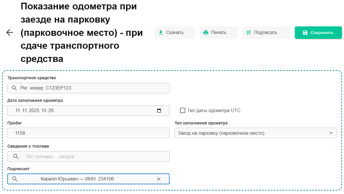 Выбираем раздел «Показание одометра». В открывшейся форме заполняем все обязательные поля и нажимаем «Подписать».