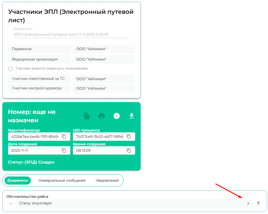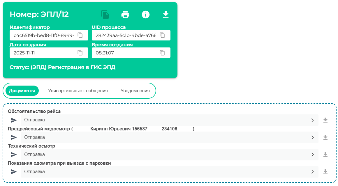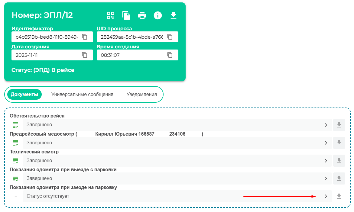 После того как QR был получен и передан водителю в ИС ЭПД сформировалась новая задача на формирование Т5 показания одометра при заезде.