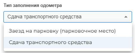 Также на данном этапе можно передать транспортное средство другому водителю, для этого требуется в разделе «Тип заполнения одометра» выбрать сдача транспортного средства.