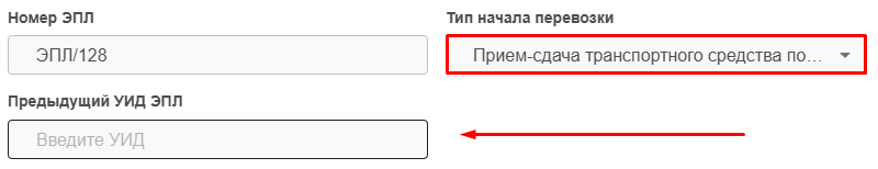 Если вы принимаете транспортное средство от предыдущего водителя, требуется в разделе «Тип начала перевозки», выбрать соответствующий пункт и указать предыдущий УИД ЭПЛ.