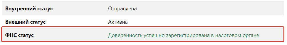 ФНС — доверенность успешно зарегистрирована в налоговом органе;