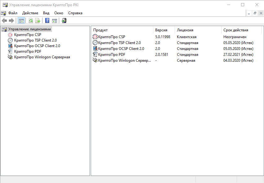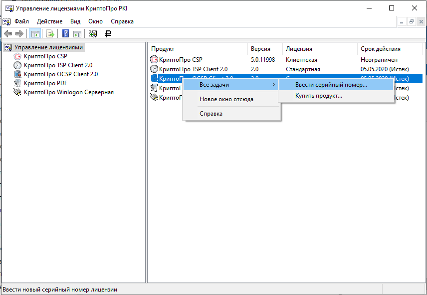 В раздел «Управление лицензиями» и кликните правой кнопкой мыши на продукте «КриптоПро OCSP Client 2.0», выберите пункт «Все задачи» -> «Ввести серийный номер».
