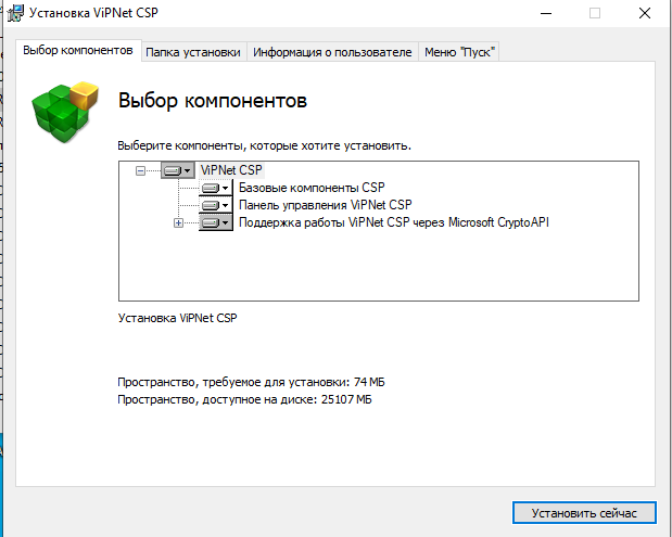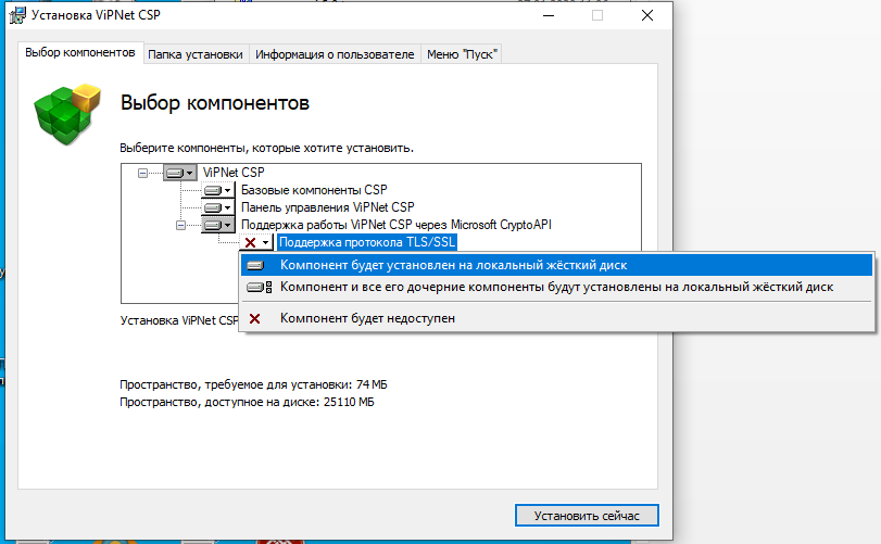 Далее нажимаем на пункт «Поддержка работы Vipnet CSP через Microsoft CryptoAPI», после «Поддержка протокола TLS/SSL» выбираем «Компонент будет установлен на локальный жесткий диск», по завершению действия нажимаем кнопку «Установить сейчас»