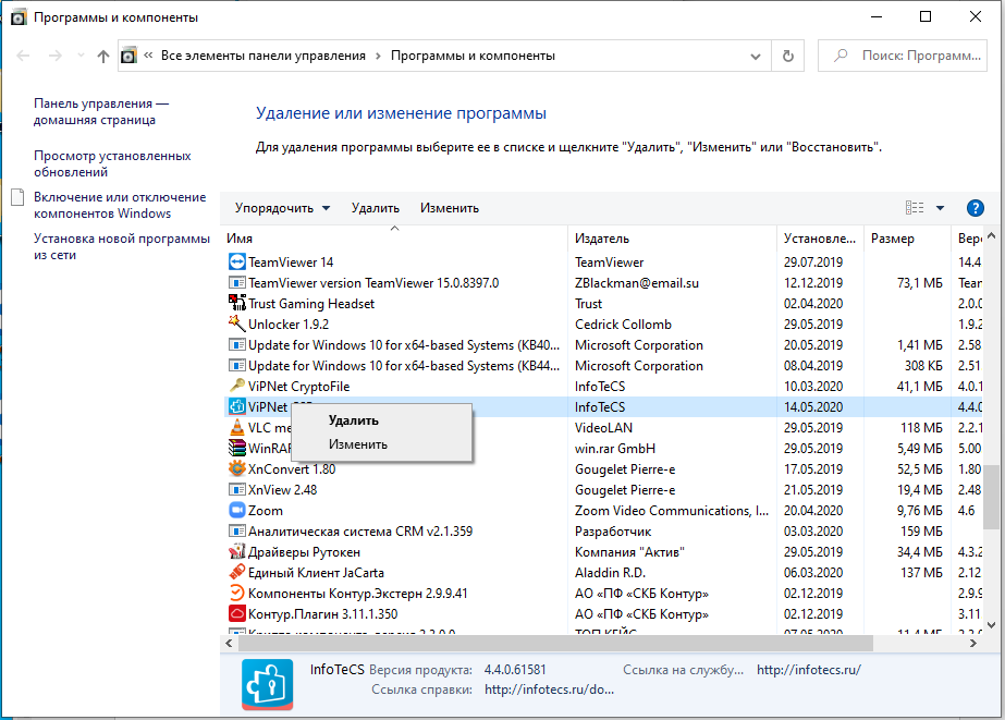 «параметры ПК» – «Приложения» найти приложение «Vipnet CSP», выбрать его и нажать «удалить».